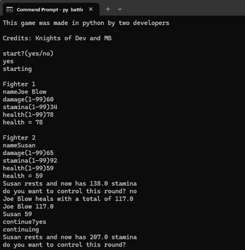 Text Battlesim is a battle simulator made in python. This was made by two developers and is a very small project. You can control fighter 1 and you can set there stats. More stuff will be added in the future.
